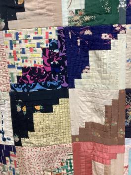 An early 20th century Log Cabin patchwork bedcover, worked in plain and printed silk, rayons and cottons from 1900 to 1940’s. Edged with a triangular patchwork border on three sides. Cover unlined. 158cm wide x 192cm long. Condition - there are a few areas were the fabric has torn and is worn and needs replacing, but overall the colours are strong as is the fabric.