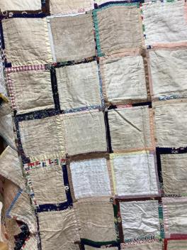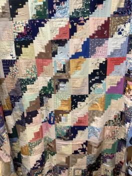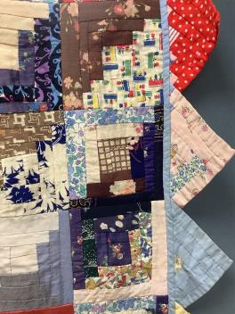 Lot 299 , An early 20th century Log Cabin patchwork bedcover, worked in plain and printed silk, rayons and cottons from 1900 to 1940’s. Edged with a triangular patchwork border on three sides. Cover unlined. 158cm wide x 192cm lon