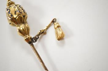 Lot 1911 , An early 20th century Viennese yellow metal, ruby, diamond and sapphire set 'clover' stick pin, 68mm, together with a yellow metal and blue enamel set stick pin.