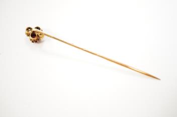 An early 20th century Viennese yellow metal, ruby, diamond and sapphire set 'clover' stick pin, 68mm, together with a yellow metal and blue enamel set stick pin.