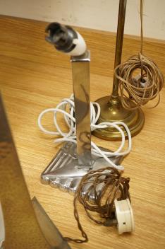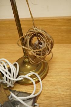 Lot 409 , An early 20th century adjustable brass table lamp with weighted base, and two other electric table lamps, two glass shades, tallest 56cm