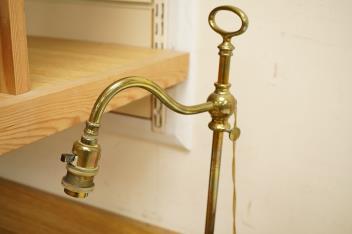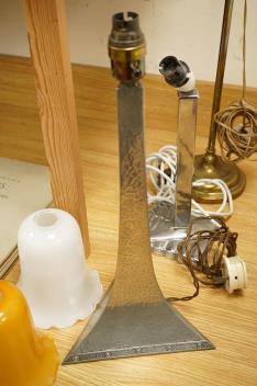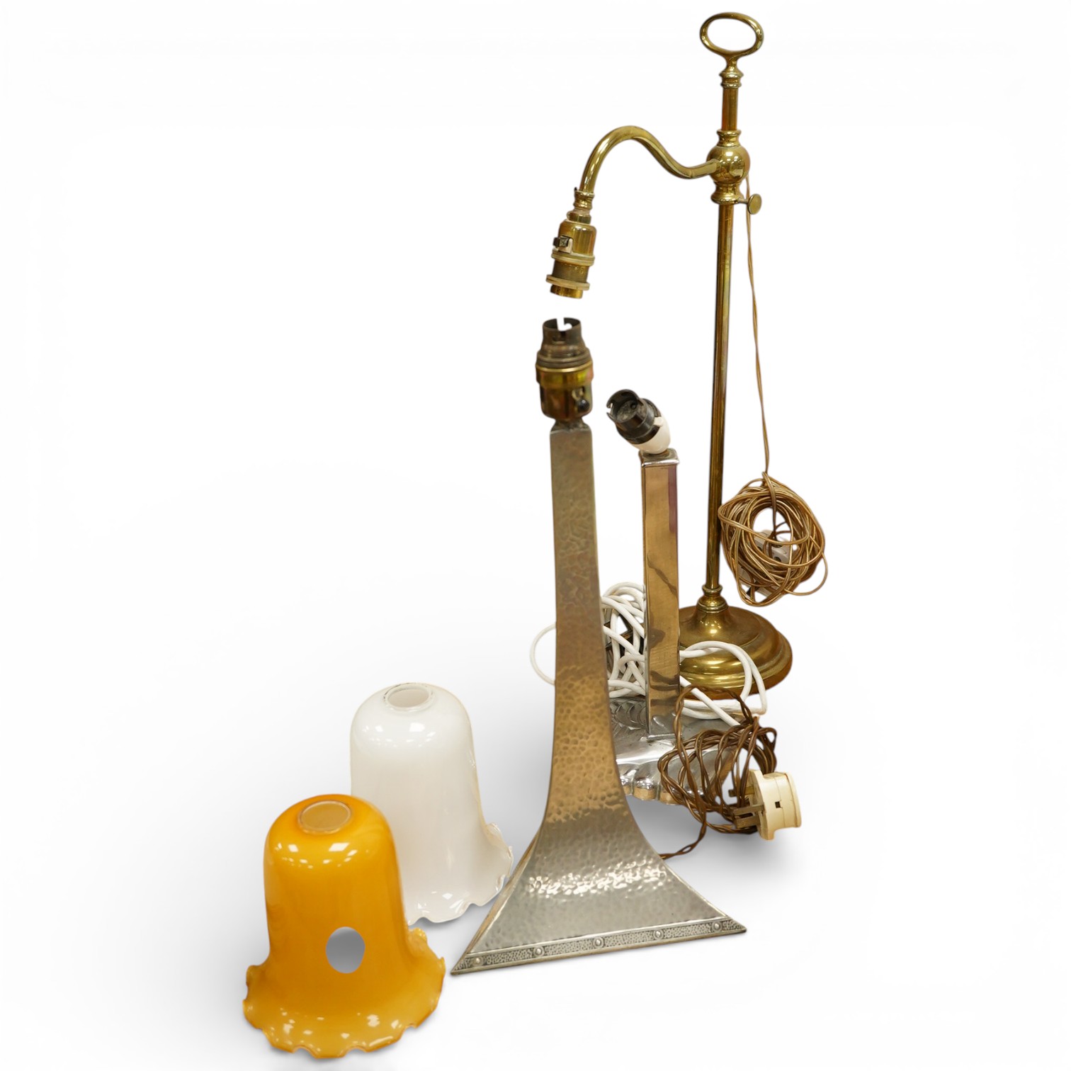 An early 20th century adjustable brass table lamp with weighted base, and two other electric table lamps, two glass shades, tallest 56cm