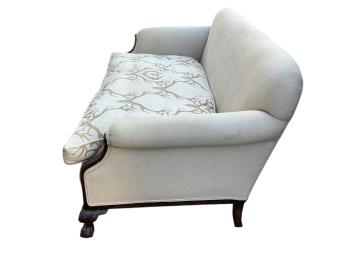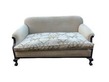 An early 20th century upholstered settee with stag head printed cushion seat, width 150cm, depth 84cm, height 76cm