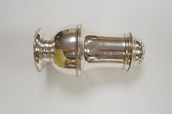 Lot 2840 , An early George II silver baluster pepperette, maker T?, London, 1734, with engraved crests, height 91mm, 82 grams.