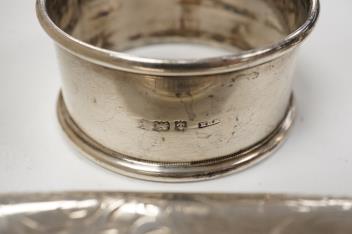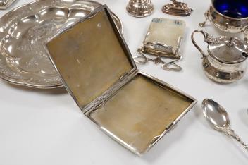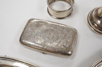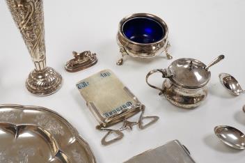 An early Victorian engraved silver plate, of cusped form, by Riley & Storer, London, 1844, with later engraved inscription, 17.5cm, together with two later silver cigarette cases, three silver condiments, a late Victorian silver posy vase by William Comyns, a silver dwarf candlestick, a silver mounted nail buffer, silver calendar holder, silver napkin ring and eight other white metal items.