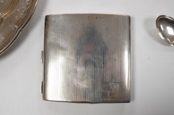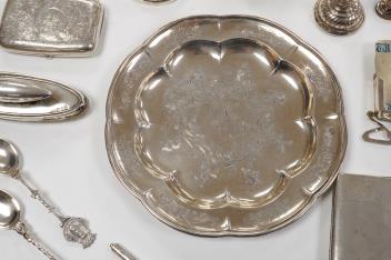 Lot 1831 , An early Victorian engraved silver plate, of cusped form, by Riley & Storer, London, 1844, with later engraved inscription, 17.5cm, together with two later silver cigarette cases, three silver condiments, a late Victoria