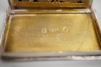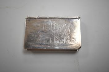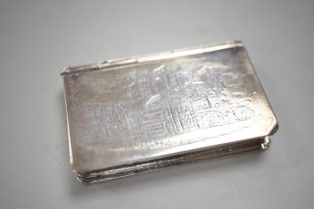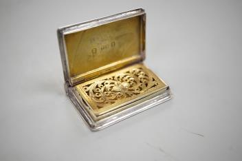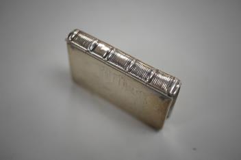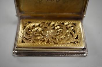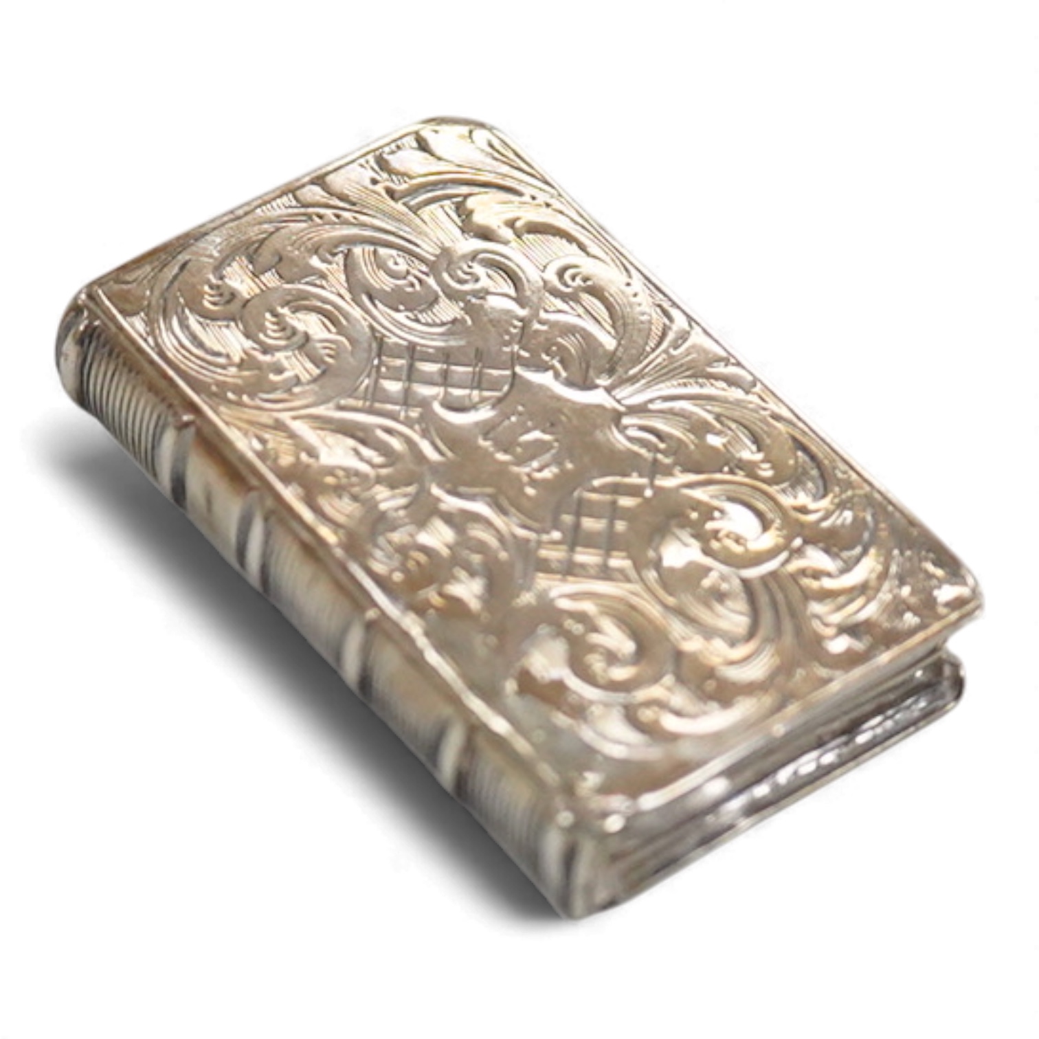 Lot 836 , An early Victorian silver rectangular vinaigrette, modelled a book, with engraved decoration(tired), Taylor & Perry, Birmingham, 1846, 40mm.