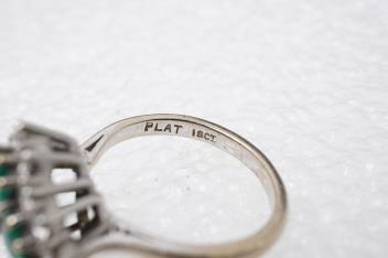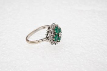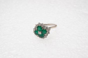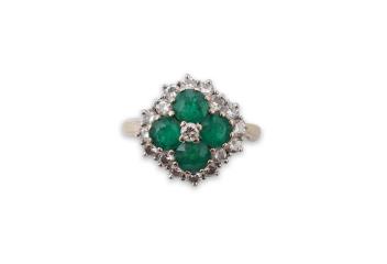 An emerald and diamond cluster ring, set with four circular-cut emeralds, centring on and bordered with brilliant-cut diamonds totalling approximately 0.90 carats, mounted in white gold and platinum, size L1/2, stamped 18CT PLAT