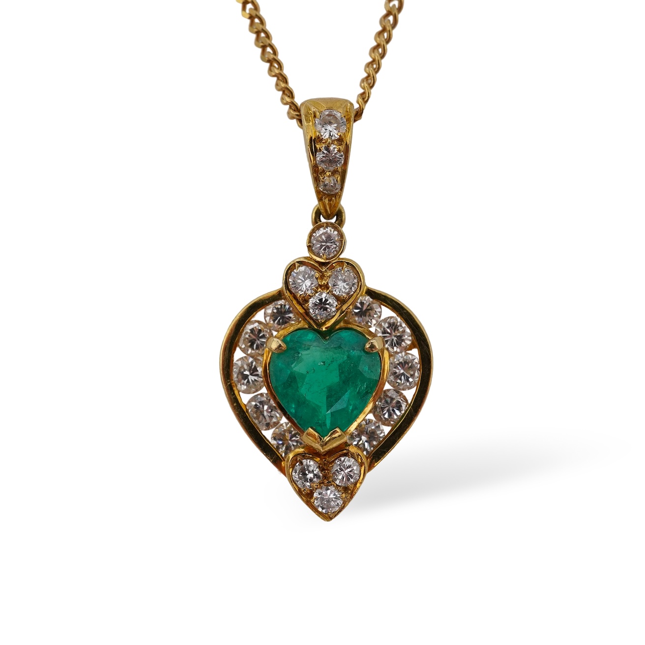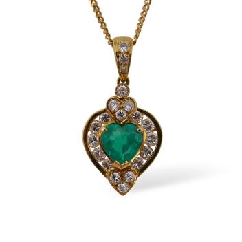 An emerald and diamond pendant, set with a heart-shaped emerald weighing approximately 0.50 carats, within a border set with brilliant-cut diamonds totalling approximately 0.50 carats, to a fine chain necklace, mounted in gold, pendant length 2.4cm stamped 750, chain length 40cm, stamped 585, Italian maker's marks, combined gross weight approximately 5 grams