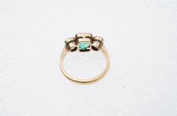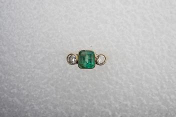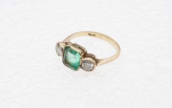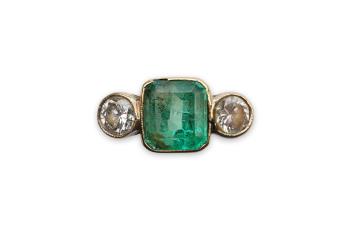 Emerald measuring approximately 6.5 x 6.4 x 5.1mm, good colour and clarity, asymmetrical pavilion facets, typical inclusions visible, overall in good condition. Some minor wear to collet settings. Diamonds bright and lively.
