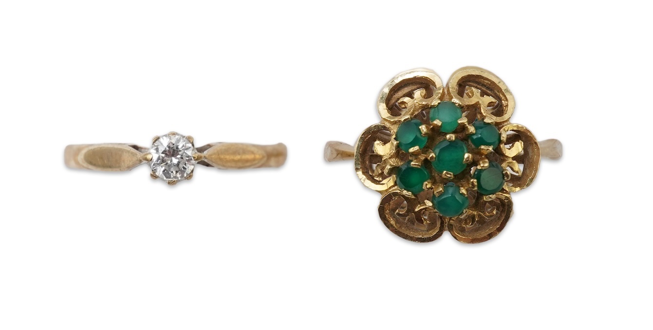 An emerald cluster ring and diamond solitaire ring, comprising: a ring set with a brilliant-cut diamond weighing approximately 0.15 carats, mounted in 9ct gold, size N1/2, British hallmarks, gross weight approximately 1.4 grams; and a ring of scrolled design set with a cluster of circular-cut emeralds, mounted in gold, size Q, stamped K18, gross weight approximately 3.5 grams