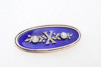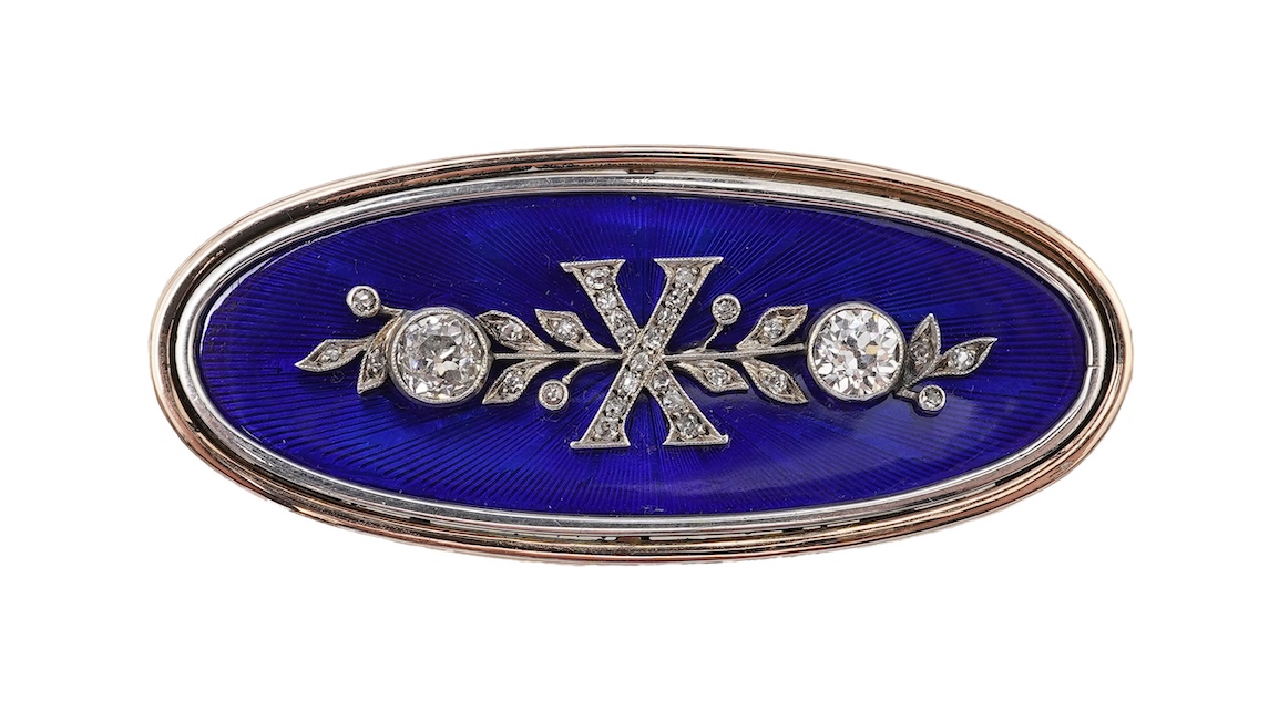 An enamel and diamond brooch, circa 1900, of oval outline, centring on an X motif between sprays of laurel, set with rose- and circular-cut diamonds, and two collet-set circular-cut diamonds totalling approximately 0.65 carats, against a ground of deep blue guilloché enamel, mounted in gold and platinum, length approximately 5cm, gross weight approximately 17 grams