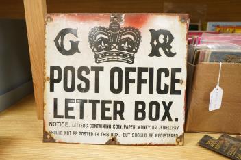 An enamelled GR Post Office Letter Box plaque, together with a group of enamel plates with details regarding the collection of post, the location of the pillar box, blanking plates, etc., with some referring to Lewes locations