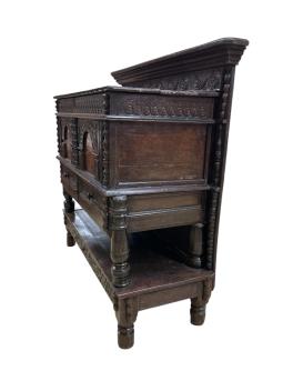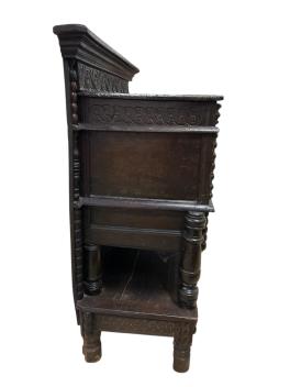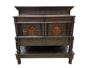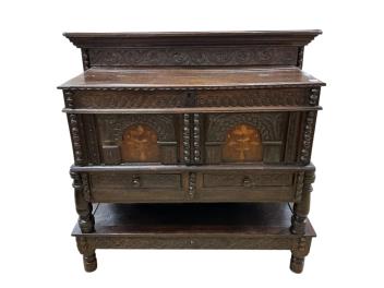 An inlaid oak cabinet, constructed from 17th century timbers, width 162cm, depth 62cm, height 148cm