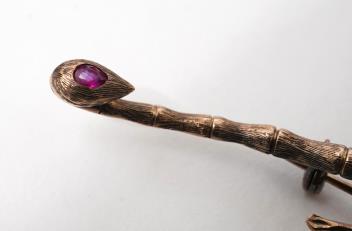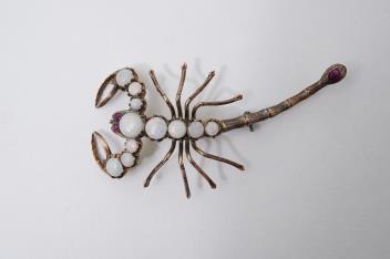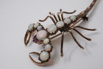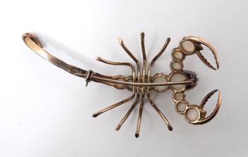 An opal brooch, designed as a scorpion, its body set with cabochon opals, its eyes and sting set with circular-cut rubies, mounted in gold, length 6.9cm, stamped 9CT, gross weight approximately 9 grams