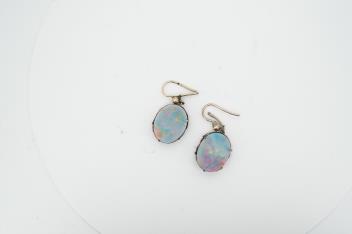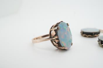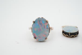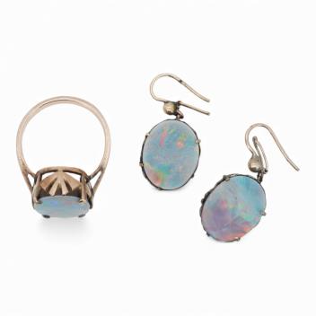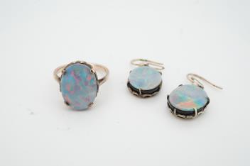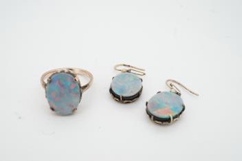 Lot 1940 , An opal doublet demi-parure, comprising: a ring set with an opal doublet measuring approximately 15.5 x 11.5mm, size N, and a pair of drop earrings of similar design, length 2.9cm each, hook fittings