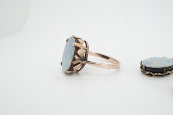 An opal doublet demi-parure, comprising: a ring set with an opal doublet measuring approximately 15.5 x 11.5mm, size N, and a pair of drop earrings of similar design, length 2.9cm each, hook fittings