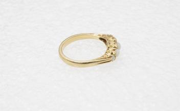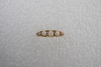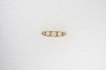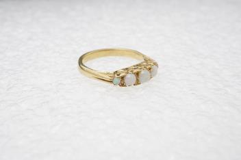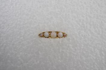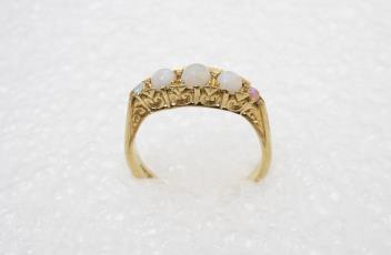 Lot 2936 , An opal five-stone ring, early 20th century, set with five cabochon opals, to a gold scrolled mount, size O, stamped 18CT, gross weight approximately 3.5 grams
