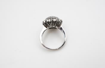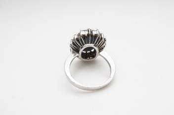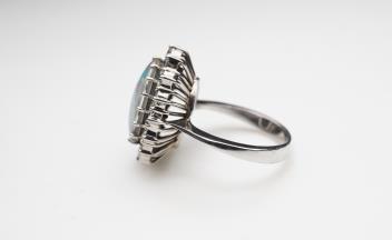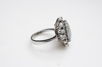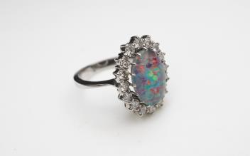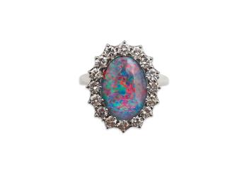 An opal triplet and diamond ring, claw-set with an opal triplet measuring 14 x 10mm, within a border of brilliant-cut diamonds totalling approximately 1.10 carats, mounted in white gold, size L, Austrian assay mark for 14ct gold