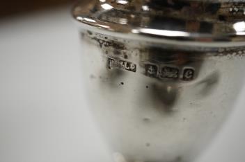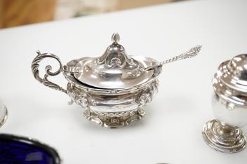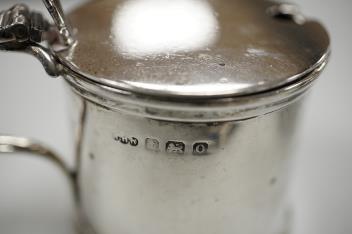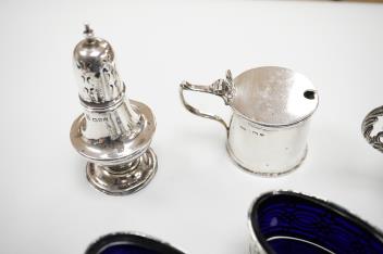 Lot 834 , An ornate Edwardian silver oval mustard pot and matching spoon by Barker Brothers, Birmingham, 1902, length, 95mm, together with five other assorted silver condiments including a pair of pierced oval salts with blue glas