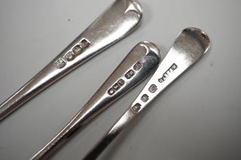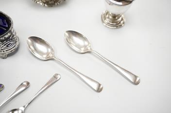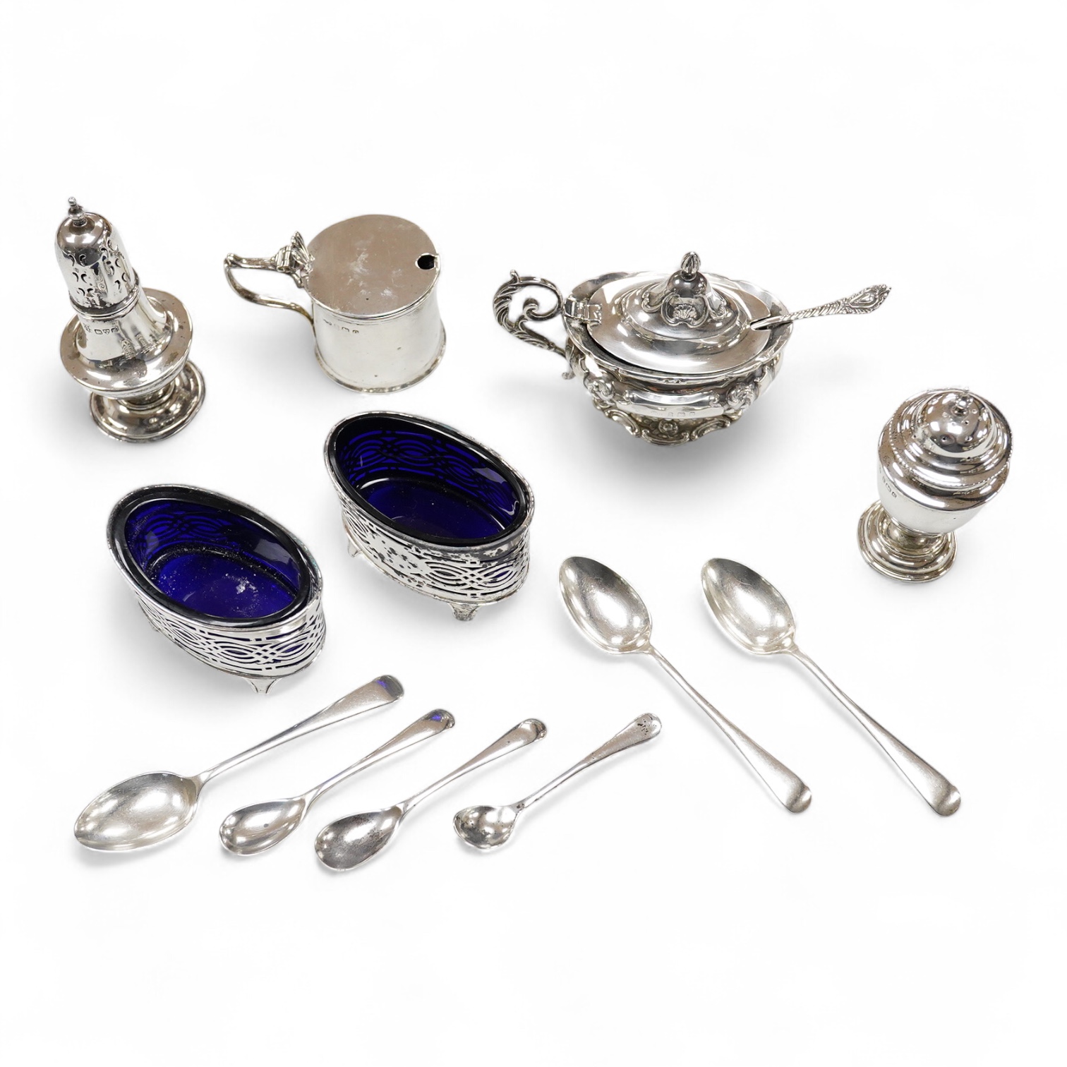 An ornate Edwardian silver oval mustard pot and matching spoon by Barker Brothers, Birmingham, 1902, length, 95mm, together with five other assorted silver condiments including a pair of pierced oval salts with blue glass liners, Nathan & Hayes, Chester, 1902, three silver condiment spoons and three silver coffee spoons.