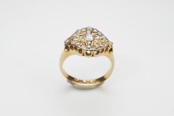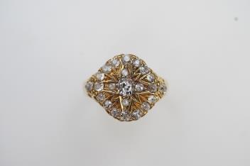 An unusual Victorian diamond signet ring, circa 1880, the front set with cushion-shaped diamonds totalling approximately 0.60 carats in a carved starburst setting, mounted in 18ct gold, size L, British hallmarks, gross weight approximately 6 grams