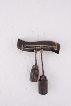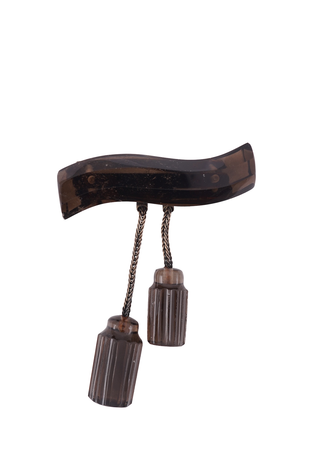An unusual Victorian smoky quartz brooch, late 19th century, composed of a curved faceted bar of smoky quartz, suspending a pair of asymmetrical pendants, each composed of foxtail chain links suspending smoky quartz pendants carved as tassels, length 4.7cm