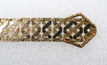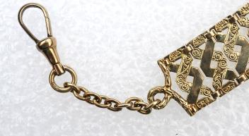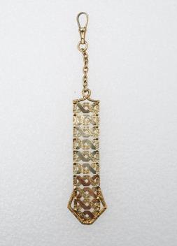 An unusual gold pendant, early 20th century, possibly intended for a chatelaine or belt, composed of panels of woven openwork design with contrasting engraved and polished finishes, suspended by a chain from a spring gate clasp, length 12.5cm, stamped 585, maker's mark NH, gross weight approximately 11 grams