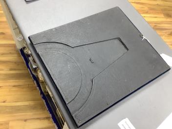 Enamel in good condition. Original frame blue velvet considerably worn; strut fitting lacking at rear.