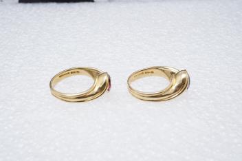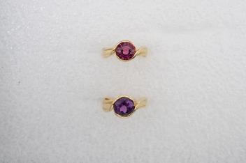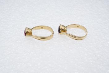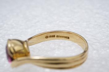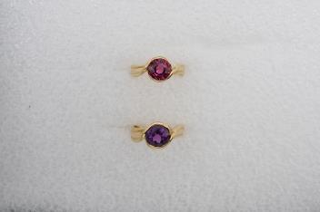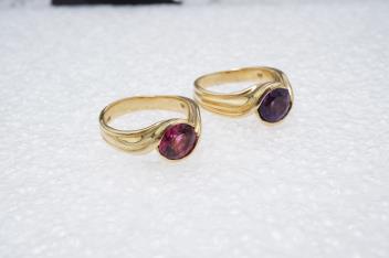 Angela Cummings, two gem-set rings, circa 1988, comprising: two rings, one set with a circular-cut pink tourmaline, the other with an amethyst, each collet-set to a twisted band, mounted in gold, each size O, signed CUMMINGS, 1988, stamped 18K, gross weight 15 grams