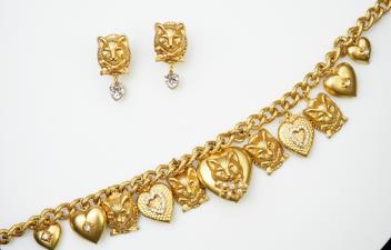 Askew London, a gilt metal necklace and pair of earrings, the engraved curb link chain suspending a series of heart-shaped pendants and pendants designed as cats with ribbon collars, accented with pastes, mounted in gilt metal, length approximately 45cm, signed Askew London, two pastes deficient; and a pair of matching earrings, length 3.9cm each, clip and post fittings