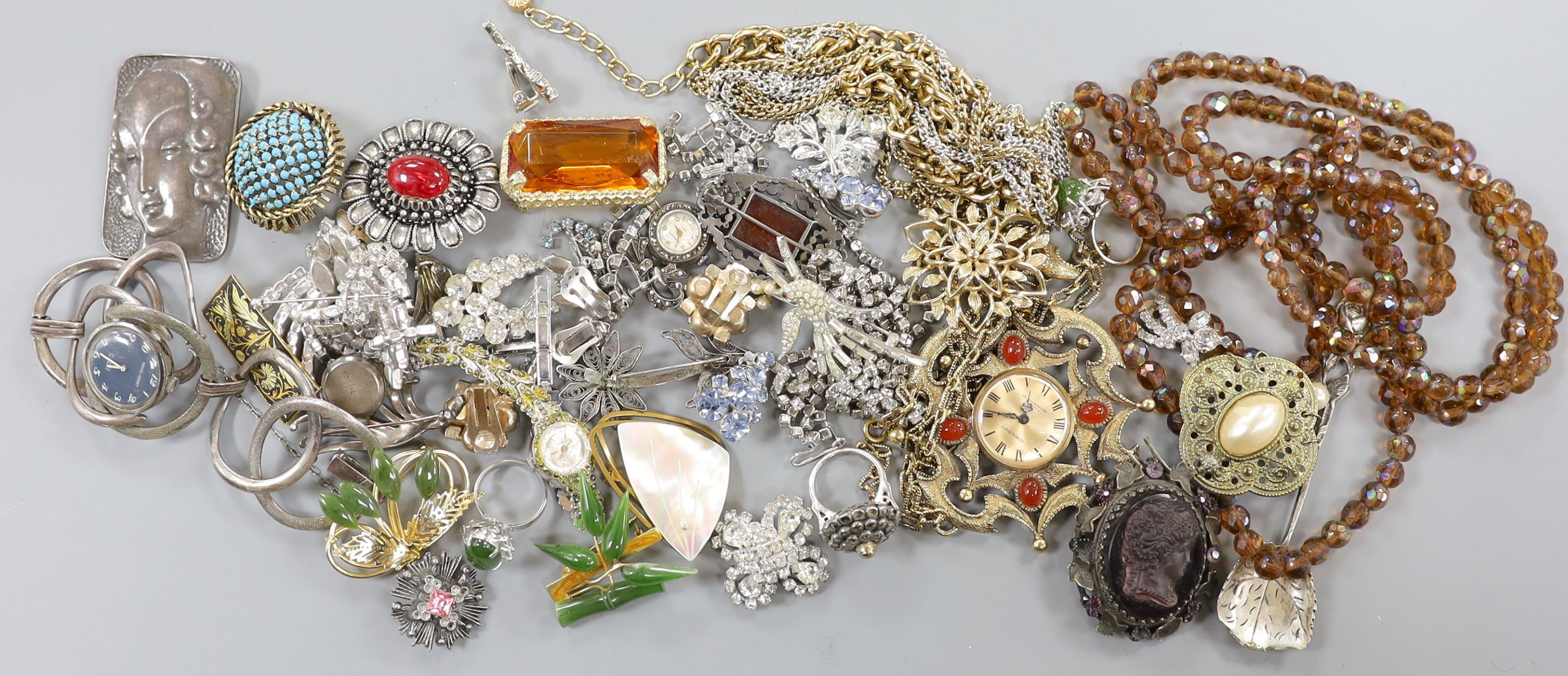 Assorted costume jewellery, including paste set brooches, necklace and earrings, Art Deco white metal brooch, etc.