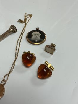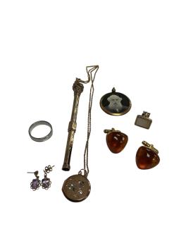 Lot 1923 , Assorted jewellery and other items including an engraved yellow metal overlaid and carnelian set propelling pencil, pair of earrings, white metal band, pair of amber set cufflinks, etc.