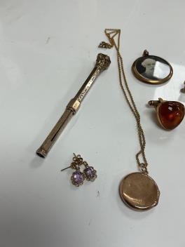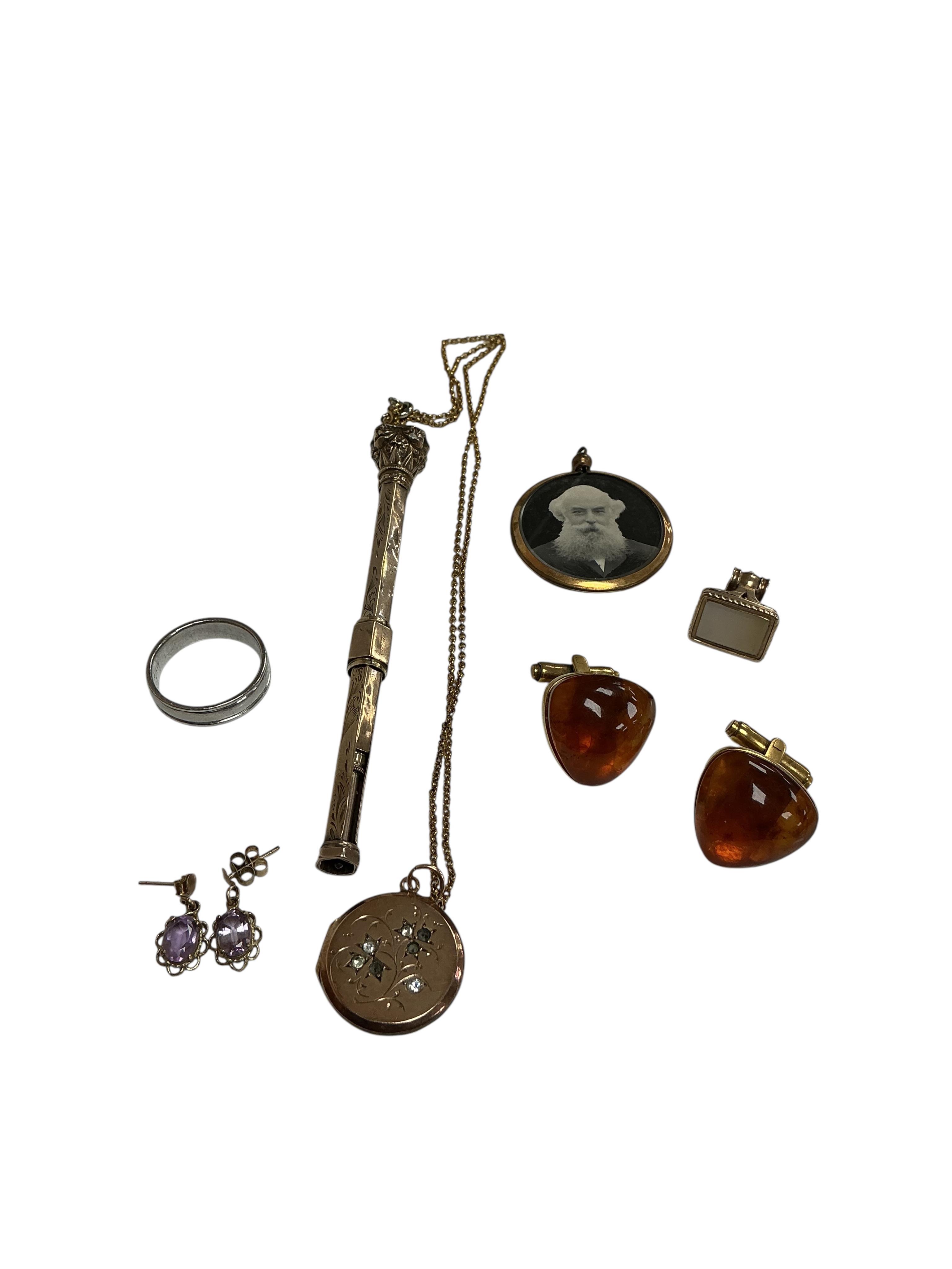 Assorted jewellery and other items including an engraved yellow metal overlaid and carnelian set propelling pencil, pair of earrings, white metal band, pair of amber set cufflinks, etc.