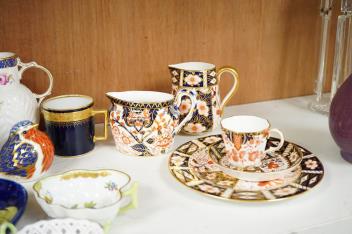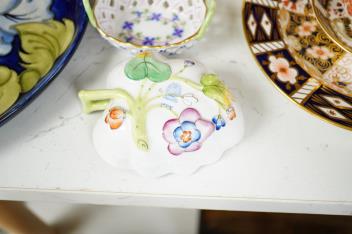 Lot 1513 , Assorted porcelain to include a Moorcroft oval dish - 23cm long, a collection of Royal Crown Derby teaware and a Robin paper weight, two Herend dishes etc