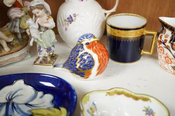 Assorted porcelain to include a Moorcroft oval dish - 23cm long, a collection of Royal Crown Derby teaware and a Robin paper weight, two Herend dishes etc