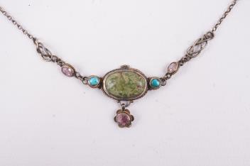 Attributed to Arthur & Georgie Gaskin, an Arts & Crafts turquoise and tourmaline bracelet, early 20th century and later, centring on a cabochon turquoise suspending a floral pendant set with a circular-cut tourmaline, between smaller turquoise cabochons, and oval pink tourmalines, mounted in bicoloured silver, to a fine link chain, length 17.5cm, unsigned, likely shortened from a necklace
