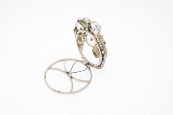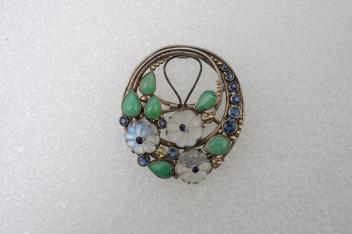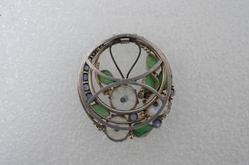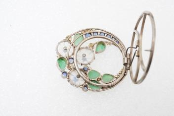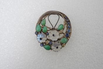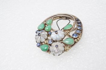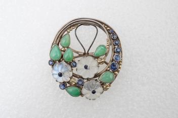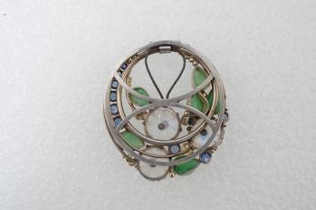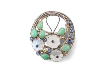 Lot 458 , Attributed to Dorrie Nossiter (1893-1977), an Arts & Crafts moonstone, sapphire and jadeite scarf clip, 1920s