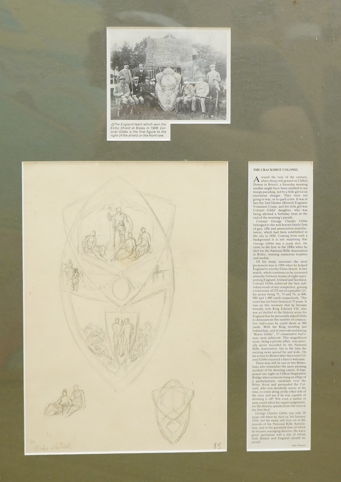 Attributed to G F Watts (1817-1904) a pencil sketch design for the Elcho Shield, National Rifle Association prize for Long Range Shooting, sketch c.1861, 25 x 17.5cm, framed together with two clippings from a related art