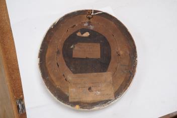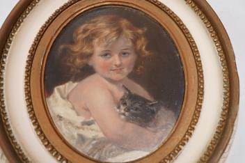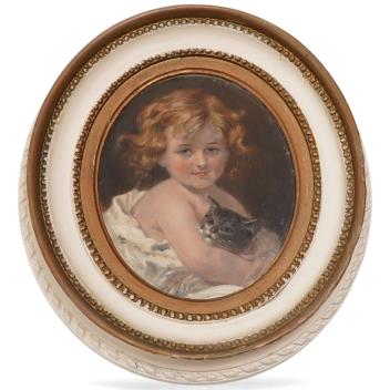 Lot 789 , Attributed to John James Masquerier (1778-1855), portrait of a young girl holding a tabby cat, Arthur Ackermann label and ink inscription verso, oval oil, 15.5 x 12.5cm