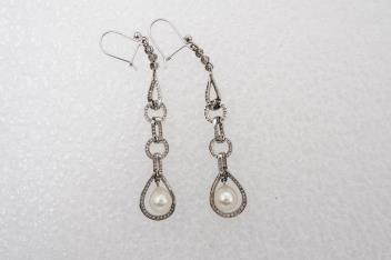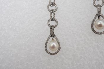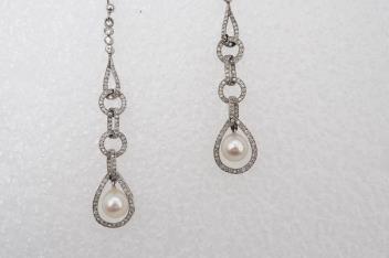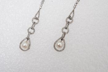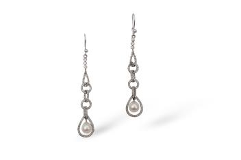 Later hook fittings, easily removed and replaced. A small patch of darker lead solder to the reverse of each of the top links, possibly as part of the manufacture to attach a hoop to secure the attaching link rather than repair - no obvious break, and not particularly obvious solder in any case. Pearls are of excellent quality, well-matched for white body colour, high lustre and overall pinkish orient. Both in good condition. Overall a superb pair of earrings in good condition.