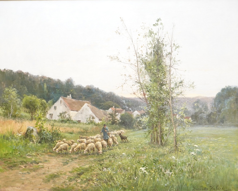 Lot 750 , Auguste Prevot-Valeri (1857-1930), A shepherd and his flock on a lane, signed lower right, oil on canvas, 78 x 97cm