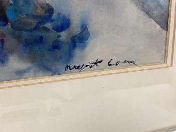 In good condition; small white spots lower-left are small unpainted patches; mount and frame good.
