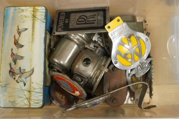 Lot 375 , Automobilia items, including six mid-20th century car badges; AA, RAC, the Royal Sussex regiment, East Sussex, etc., together with a Smiths dashboard clock, a Rolls-Royce plaque, two early motoring lamps, a W&R Jacob & C
