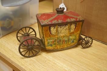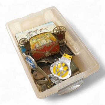 Automobilia items, including six mid-20th century car badges; AA, RAC, the Royal Sussex regiment, East Sussex, etc., together with a Smiths dashboard clock, a Rolls-Royce plaque, two early motoring lamps, a W&R Jacob & Co. Ltd. Biscuit tin in the form of a coronation coach, and another early Jacob’s Biscuits tin