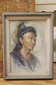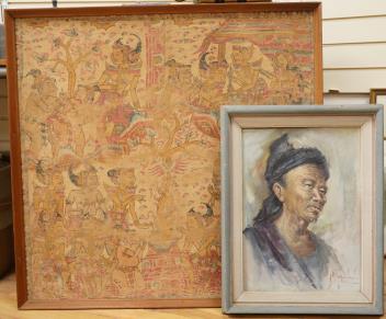 Balinese school, deities and figures, watercolour/gouache on fabric, together with a portrait, oil on canvas, largest 82 x 84cm
