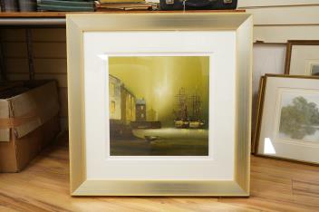 Lot 770 , Barry Hilton (b.1941), Docklands view at dusk, signed, oil, 39 x 38cm