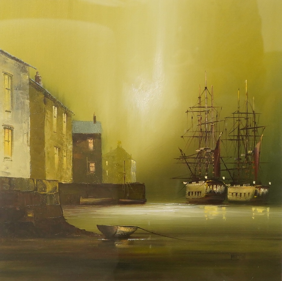Barry Hilton (b.1941), Docklands view at dusk, signed, oil, 39 x 38cm