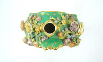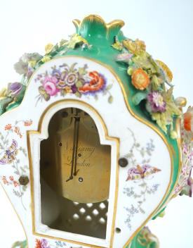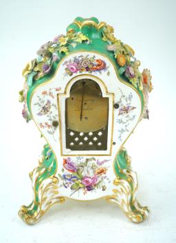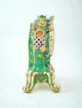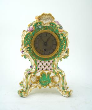Benjamin Louis Vulliamy, London, an early 19th century eight day English porcelain mantel timepiece, the single fusee movement with a gilded engine turned dial, with Roman numerals, the backplate signed Vulliamy, London, contained in a floral encrusted, green ground, gilt decorated cartouche shaped porcelain case, probably Coalport, 31.5cm high