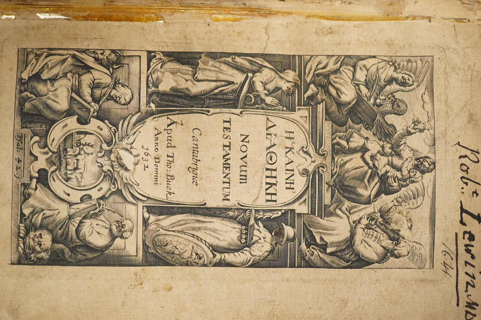 ° Bible, The First Cambridge printed Greek New Testament - [Greek title] Novum Testamentum (lacking some leaves). pictorial engraved title, text decorations and decorated initial letters; 352 (lacks 353-368), 369-468pp. old half calf and marbled boards (distressed), cr. 8vo. Cambridge: Thomas Buck, 1682.
